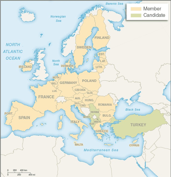 The 27 member states that make up the EU have adopted an internal single market with free movement of goods, services, capital, and labor. The EU, which is also a customs union, aims to bolster Europe's trade position and its political and economic weight in international affairs.